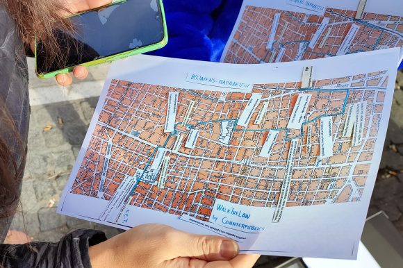 The action aims to highlight the dissonance between the fine print, the terms hidden in legal texts, such as public space concession contracts, redevelopment plans, and the vibrant life of public space that they try to tame, abuse and ultimately eliminate.