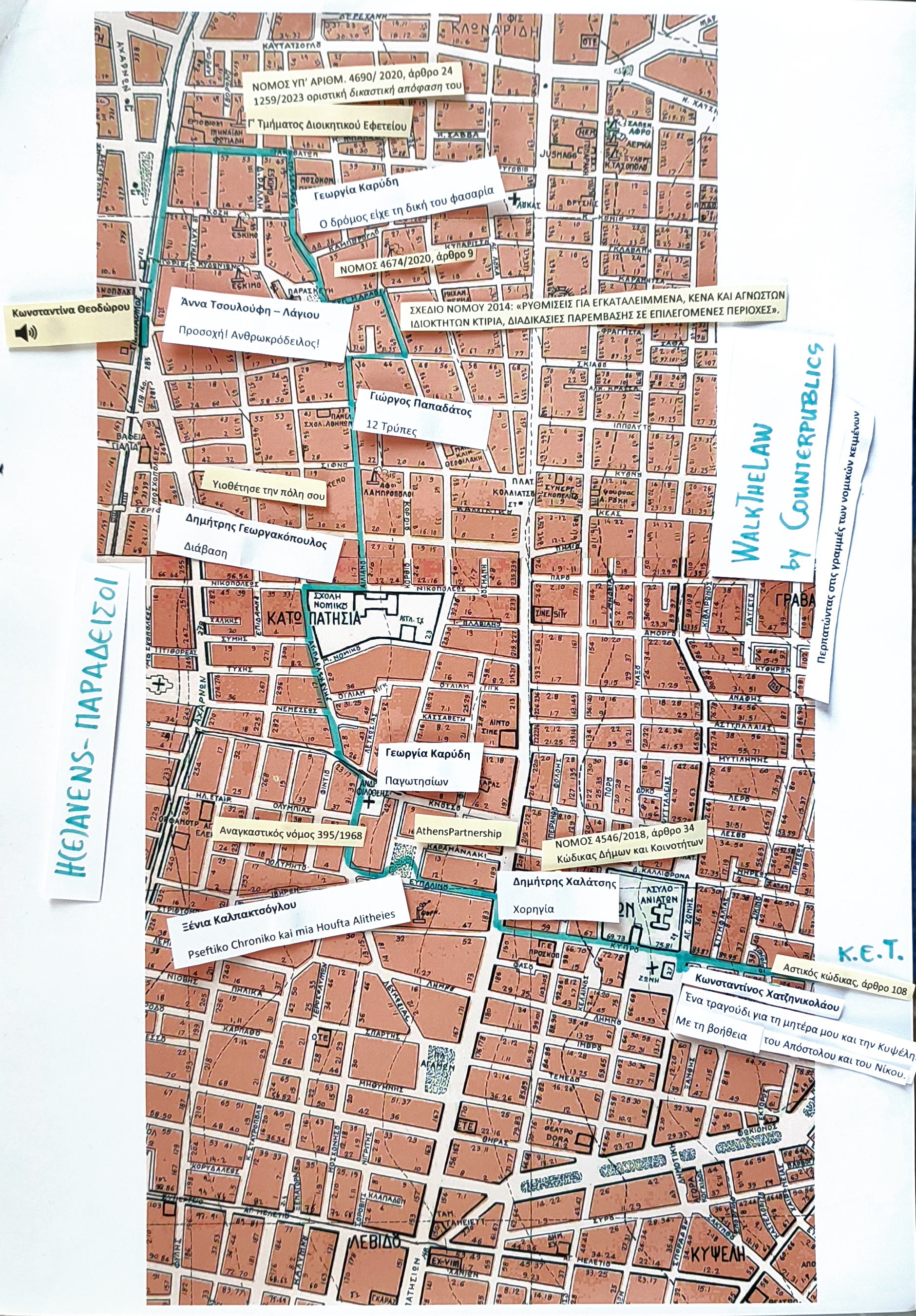 The choice of the route focuses on points-spaces linked to institutional interventions and actions, retrieves from the legal texts the details, the lines, the phrases that set the background for the encroachment of space, contrasts them in the field, attempts a connection between the letter of the law and what this implies for the “living” public space. The long, difficult to read, complex legal texts with their technical language conceal the characteristics of the urban reality that is established by various kinds of agreements, contracts, redevelopment plans. The legal text performatively accomplishes the forthcoming encroachment of public space, the opening of public space as a field of profitability, as a field of cultural hegemony and ultimately the alteration of its very character, as institutions transfer and impose an ethos/relationship of private space on public space, negating the fundamental condition of its existence, the possibility of conflict and negotiation.